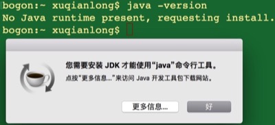 我也记不清楚之前本机的 Java 环境是否是配置好了,昨天更新了 macOS 之后,今天想装个 Jenkins 玩下,结果在运行 Jenkins 的时候发现 No Java runtime present, requesting install.