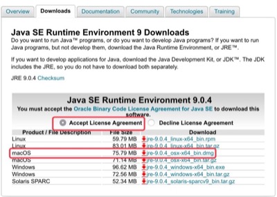 那就需要去 oracle 下载安装 JRE http://www.oracle.com/technetwork/java/javase/downloads/jre9-downloads-3848532.html;下载 dmg 包就行,需要选中 Accept License Agreement !