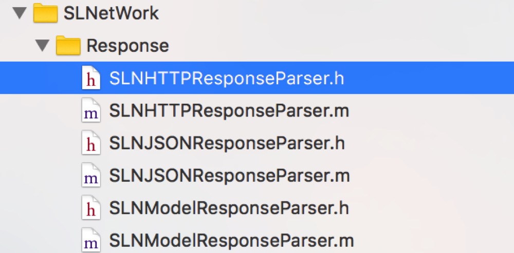 目前优秀的开源库有可以借鉴的地方吗?有,比如最流行的 AFNetworking 的响应解析处理的很好呢,跟 SLNetwork 库的区别是不支持 JSON 转 Model,对于这个问题我觉得采用继承去解决比较合适,所以建立的下面的几个类:
