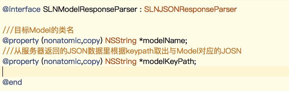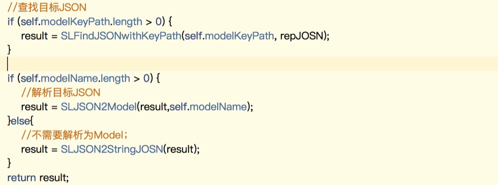 SLNetWork 提供了最基础的发起请求的方式,在业务层我们要根据业务和 SLNetWork 底层提供的方法,进行再次封装,由于底层没有提供将 JOSN 解析为 Model 的方法,那么这个工作就留给了业务层了,我是这么处理的: