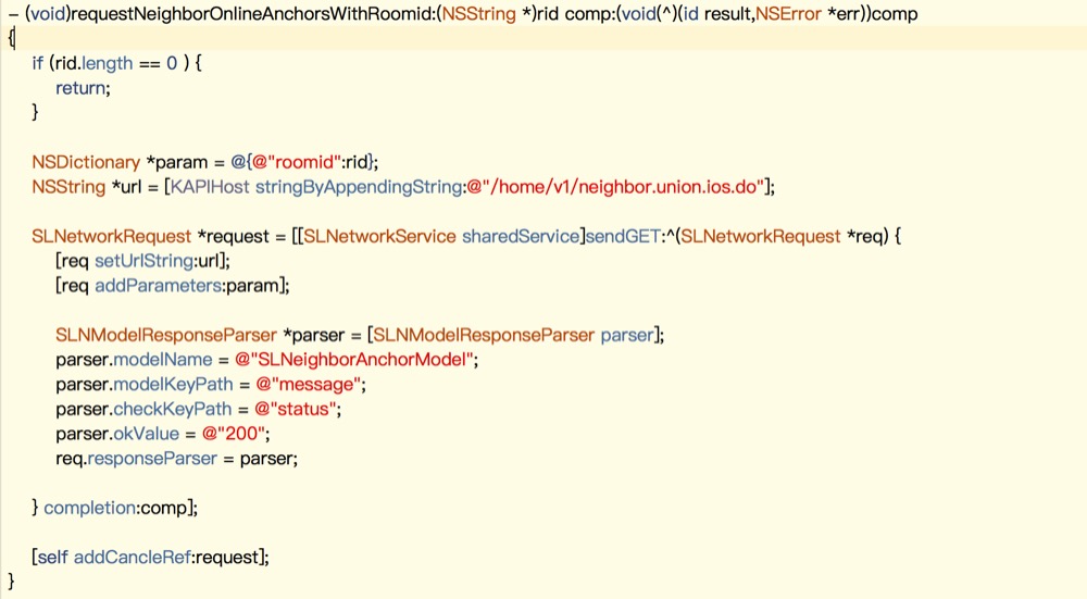 - (SLNetworkRequest *) Get:(NSString *)url params:(NSDictionary *)params completion:(SLNKHandler)chandler;