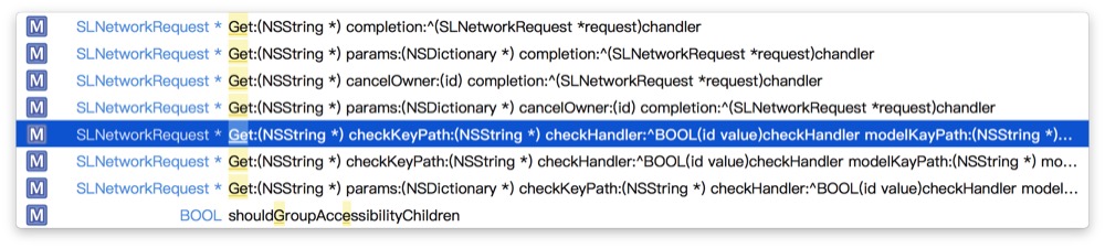 - (SLNetworkRequest *) Get:(NSString *)url checkKeyPath:(NSString *)kp checkHandler:(BOOL (^)(id value))checkHandler modelKayPath:(NSString *)mkp completion:(SLNetWorkHandler)chandler;
