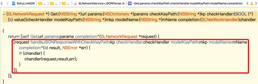 - (SLNetworkRequest *) Get:(NSString *)url params:(NSDictionary *)params checkKeyPath:(NSString *)kp checkHandler:(BOOL (^)(id value))checkHandler modelKayPath:(NSString *)mkp modelName:(NSString *)mName completion:(SLNetWorkHandler)chandler;