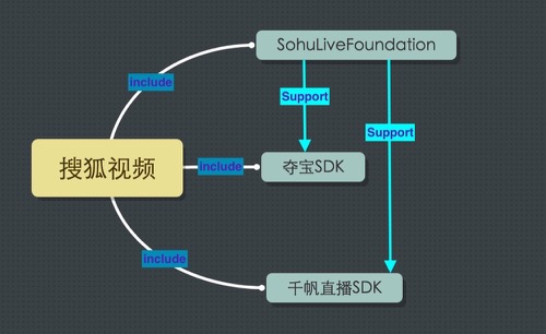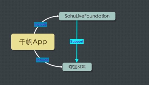 到目前为止,已经实现了前 3 条了,我们再回过头来看下第 4 条 — 将夺宝 SDK 作为直播 SDK 的一部分;由上面提到的理论大家很容易想到,可将 SohuOneSDK 引用到 SohuLiveSDK(千帆直播SDK),而 SohuLiveFoundation 为 SohuOneSDK 和 SohuLiveSDK 提供基础支持,集成到视频的时候,将这三个 framework 一并提供集成即可,这里需要说明的是,SohuOneSDK 和 SohuLiveSDK 均不包含 SohuLiveFoundation 的可执行文件,好处就是避免符号重复定义!!!